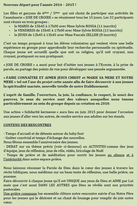Aumônerie « JOIE DE CROIRE » en 2014/2015