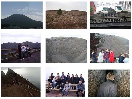 Pour certains, le réveil à 6h est difficile, mais tout le monde est prêt à 7h30 quand le bus nous conduit au Vésuve. Mme Latscha nous fait une blague : elle prétend qu’en raison de sa longueur le bus ne pourra pas monter la route en lacet qui conduit au parking intermédiaire, et que nous devrons monter jusqu’au sommet…depuis la base ! Le temps est prometteur quand nous arrivons vers Naples, mais il se couvre à nouveau au fur et à mesure que nous montons à pied, et les plus courageux qui arrivent au bout du sentier essuient même des rafales de vent et quelques flocons de neige.