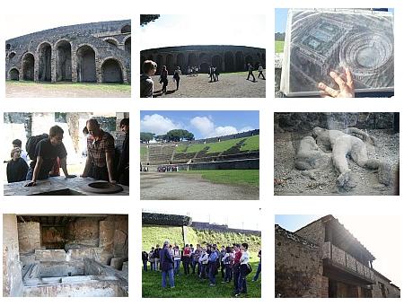 Encore un départ matinal, mais Pompéi nous attend, ainsi que notre nouveau guide, Ranieri. Partant de l’amphithéâtre, pendant plus de deux heures il nous fait remonter le « Decumanus maximus » - la rue principale de la ville - en nous montrant, de part et d’autre, les maisons les plus intéressantes. Il nous parle aussi du système d’alimentation en eau, très perfectionné, et bien sûr de la tristement célèbre éruption d’août 79, qui détruisit la ville et dont les nuées ardentes à près de 6000° brûlèrent les habitants.