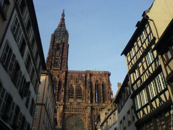La cathédrale Notre-Dame de Strasbourg a été construite à partir de 1176 jusqu’en 1439. Plusieurs architectes y ont contribué : Michel de Fribourg (façade), Klaus de Lohr (façade), Erwin von Steinbach (façade), Ulrich d’Ensingen (tour octogonale) et Johannes Hültz (flèche). Elle mesure 142 m et est reconnaissable par son unique clocher surmonté d’une flèche. Son style dominant est le gothique.