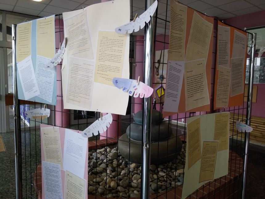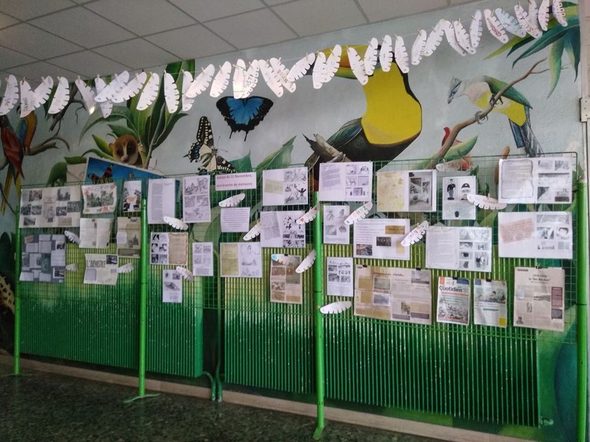 Les diverses productions des élèves ont été réunies dans une exposition dans le hall d’accueil, intitulée « Autour du 11 novembre, une tranche de mémoire » au-dessus de laquelle semblaient voleter les colombes de la Paix.