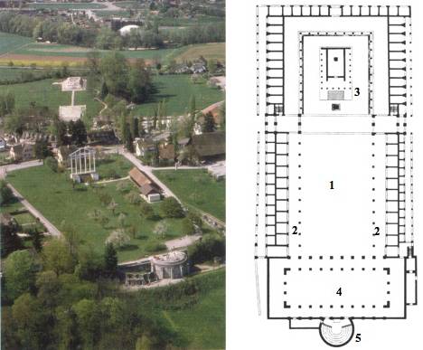 1.Forum ; 2.Tabernae ; 3.Templum ; 4.Basilica ; 5.Curia