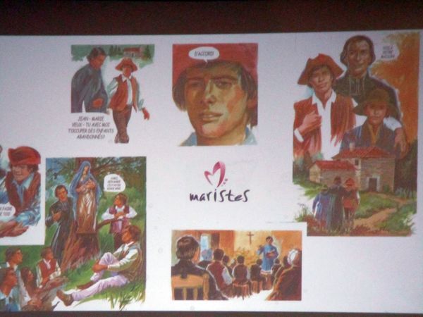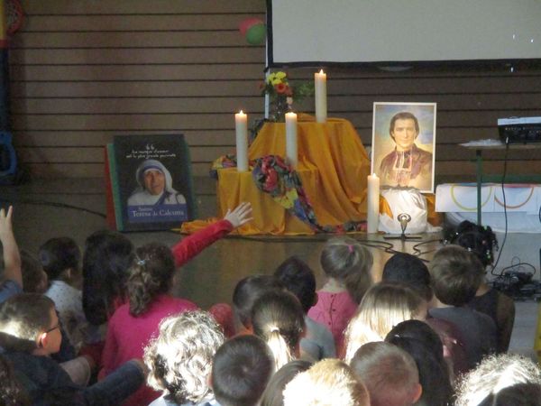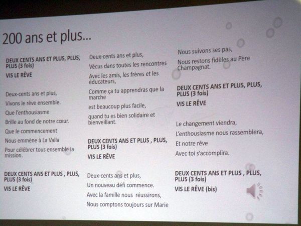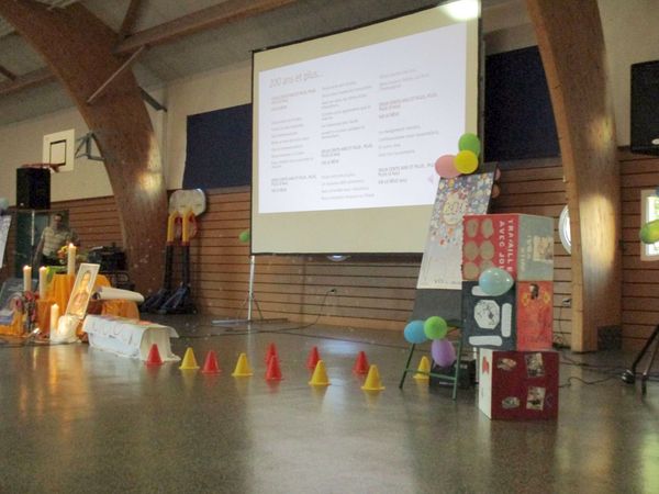 Le nouveau chant « 200 ans et plus » accueillait l’arrivée des classes, dans une ambiance festive, bulles et ballons à l’appui. Le refrain, très facile, a pu être repris par tous. Ensuite, l’histoire du rêve de Marcellin nous a été contée par Anne-Noëlle, avec des images choisies, puis Mme Glanzmann nous a montré des photos pour nous détailler tout ce que font les Frères Maristes dans le monde depuis 200 ans. Enfin, Mme Garvin nous a dévoilé la nouvelle affiche du thème, en attirant notre attention sur tous les détails. Le Père Daniel a conclu en nous donnant des pistes pour essayer de bien vivre ce nouveau thème.