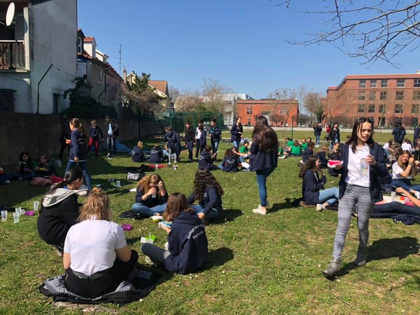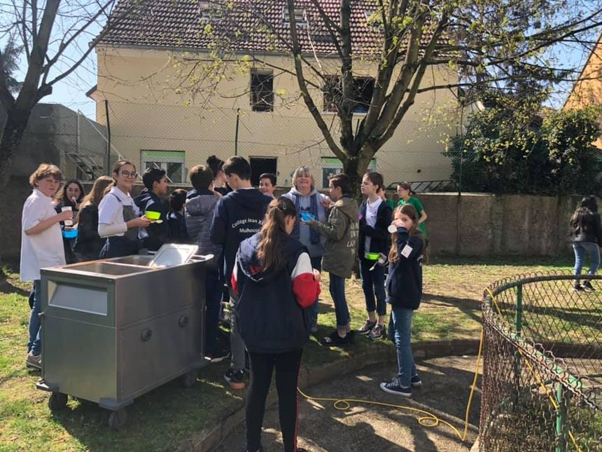 Un temps fort vécu en deux temps : partage du repas, frugal, en extérieur, puis animations autour des projets de solidarité en salle Mertian, avec une projection présentée par M. Lirot, une animation sportive (chorégraphie de step) préparée par les élèves de Mme Gebel et même un chant malgache, Dia Veloma, proposé par les élèves instrumentistes de la classe CHAM et repris par les élèves présents.
