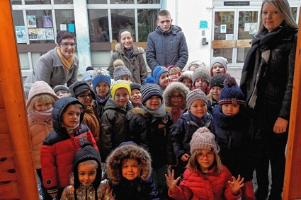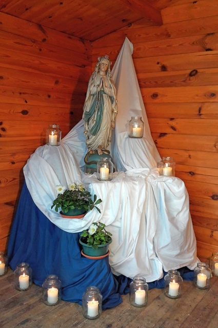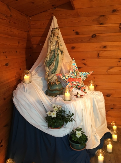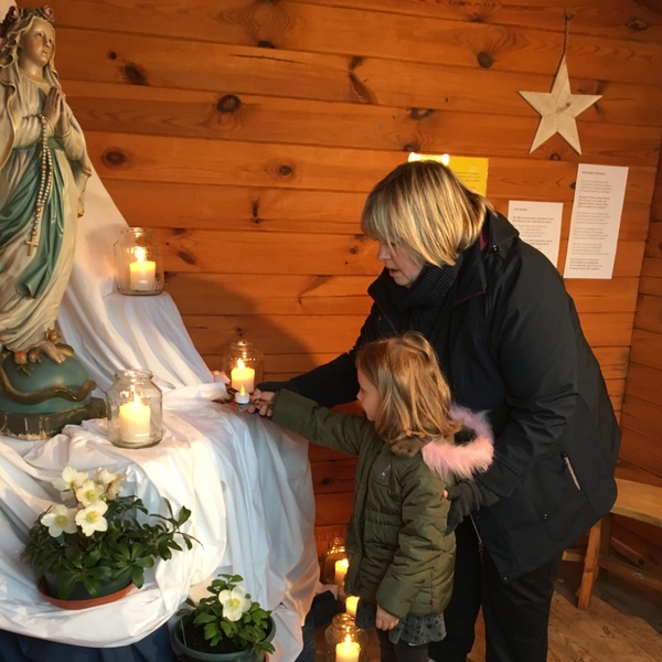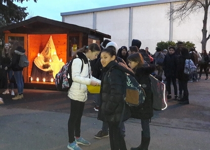 Une chapelle éphémère préparée avec soin par Elisabeth Hassler accueillait nos élèves dans la cour de récréation, dans le petit chalet en bois illuminé de bougies. Temps de recueillement, temps de prière, un moment de Paix partagé sous la protection de Marie.