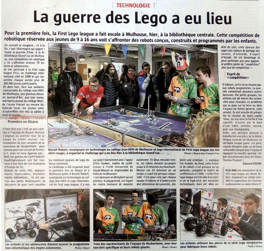 Deux équipes du club robotique du collège - activité qui a lieu tous les jeudis entre midi et deux - ont participé à la toute première rencontre de la First Lego League (FLL) à Mulhouse.