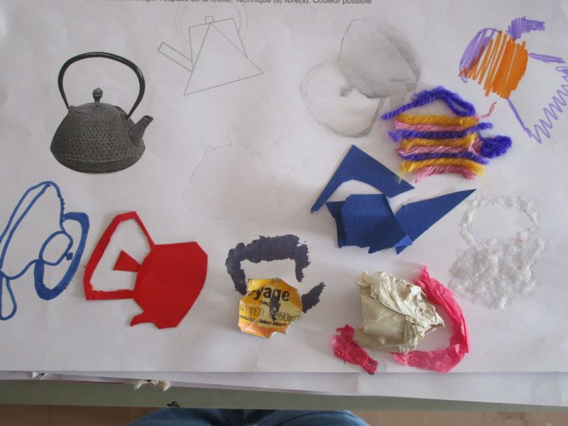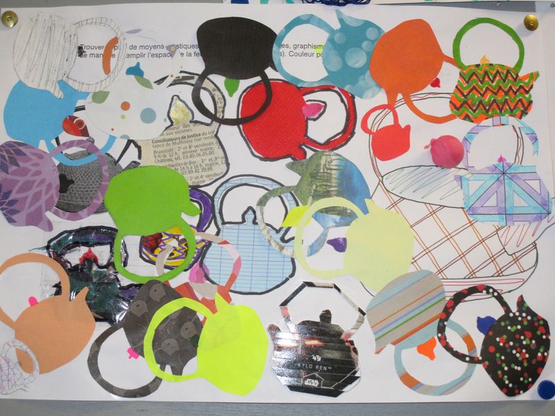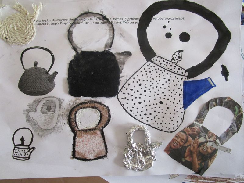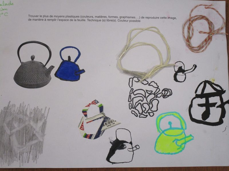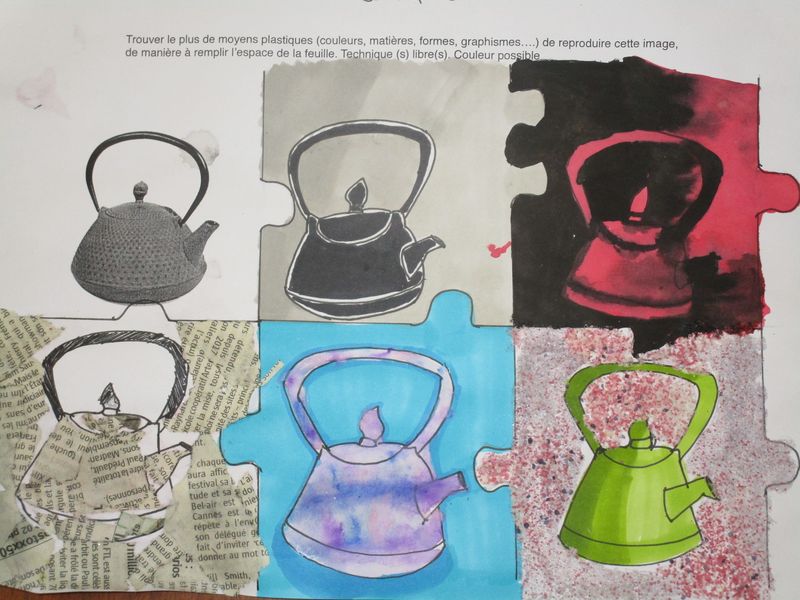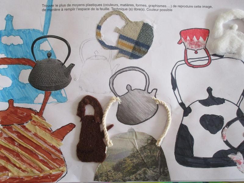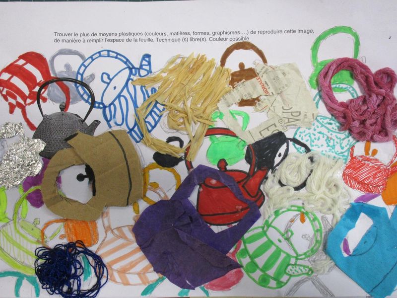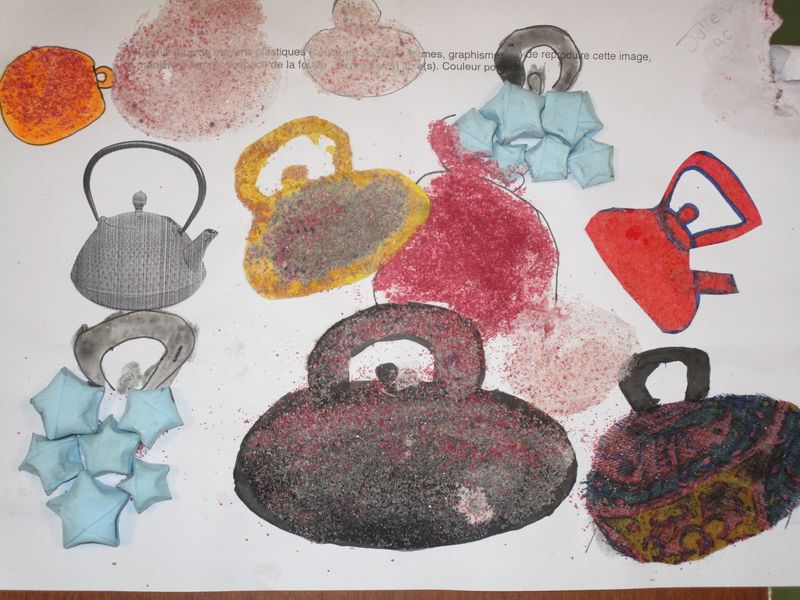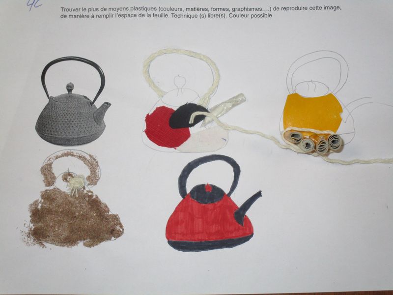 Le sable, l’encre, le papier, le tissu, l’échelle... ont été quelques-uns des moyens utilisés par les élèves de 4B, 4C et 4G pour chercher à saturer un support A4 en reproduisant l’image d’un objet, une théière, exploitant ainsi l’écart inévitable entre une image et sa reproduction.