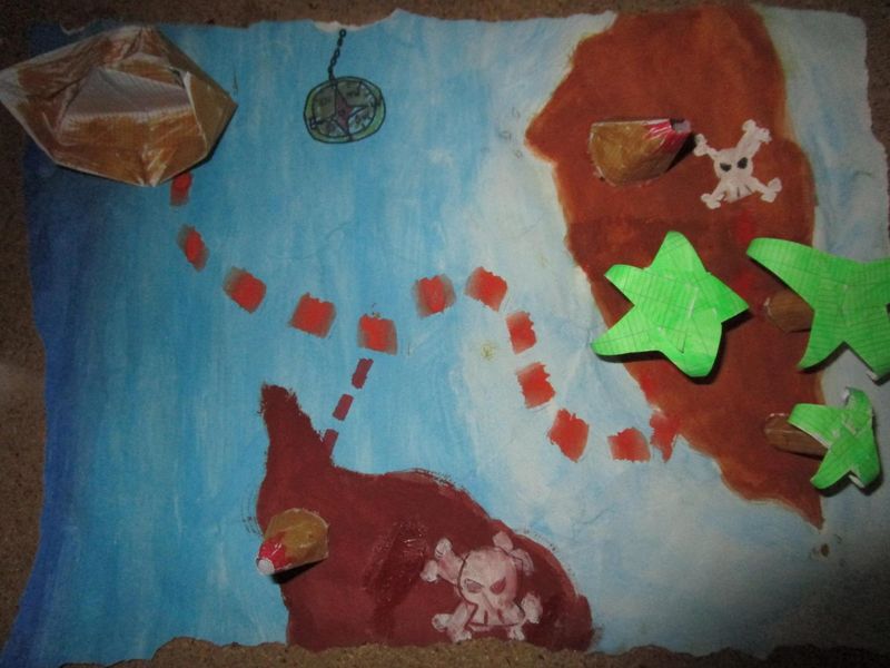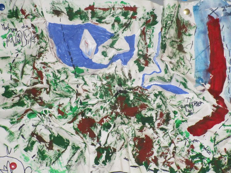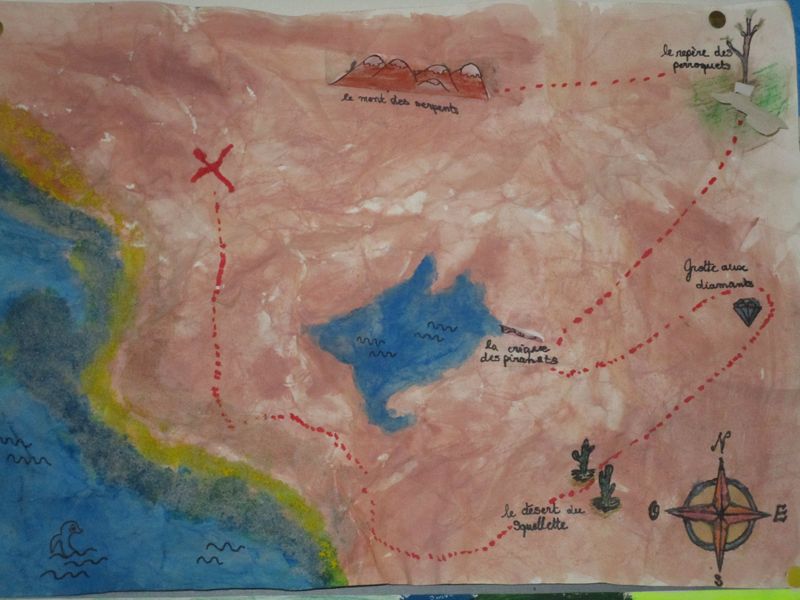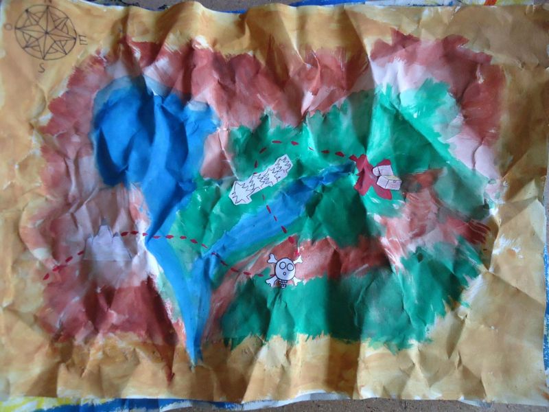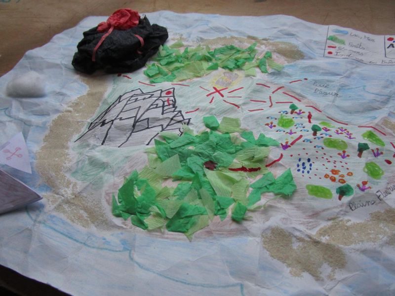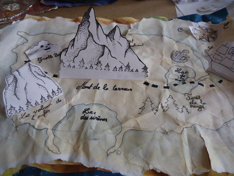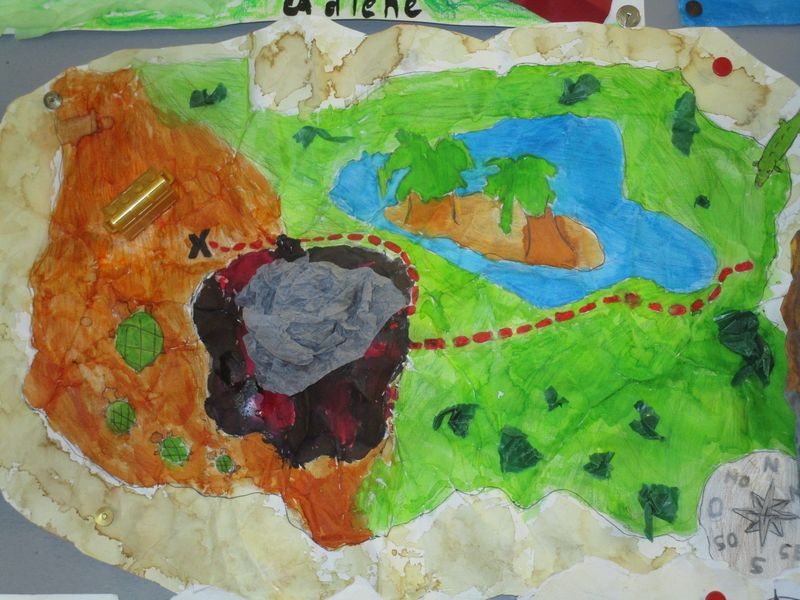Pour découvrir la notion de matérialité et ses effets possibles, les élèves de 5C, 5D et 5F ont été invités à plier, froisser, modeler… une feuille A3 pour lui donner du relief. A partir du relief obtenu, ils ont imaginé et réalisé des cartes d’une île au trésor dont voici quelques exemples :