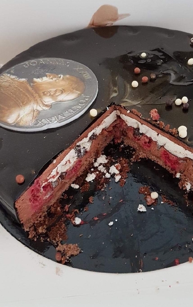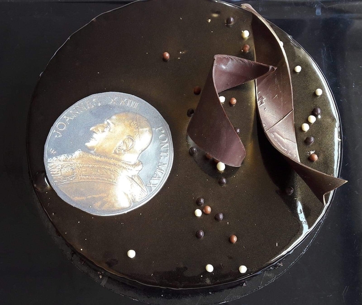 Pour marquer notre attachement à notre saint patron Jean XXIII et à l'occasion du 137ème anniversaire de sa naissance le 25 novembre 1881, notre chef de cuisine Bruno Fritz a réalisé en son honneur un délicieux entremet : une création originale au chocolat, beurre salé, meringue, framboises... surmontée d'un joli médaillon en chocolat doré à l'effigie de Saint Jean XXIII.