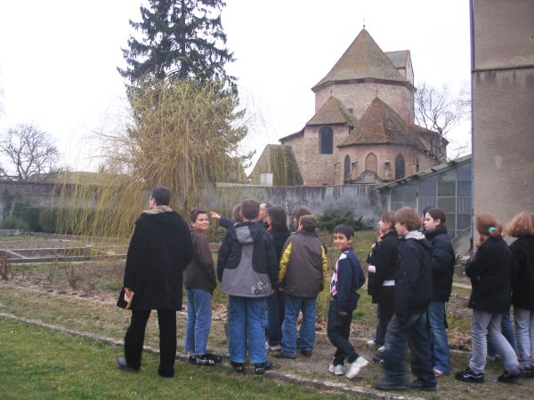 Frère Jean-Pierre nous a accueillis dès la sortie du bus et nous avons commencé par la visite de l’abbatiale. Très belle, celle-ci a été construite en 1030 d’après les plans de l’église d’Aix-la Chapelle en Allemagne. L’abbatiale d’Ottmarsheim est aussi octogonale, mais est beaucoup plus petite ! Les fresques ont été peintes en 1471 et Frère Jean-Pierre nous a montré une scène du jugement dernier et une autre de l’archange Saint-Michel. Mais l’abbatiale a été endommagée à la Révolution et le Couvent a été détruit presque en totalité ! Il a été depuis reconstruit et entièrement nettoyé car un incendie a aussi recouvert de suie l’orgue et les murs intérieurs.