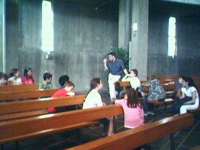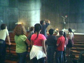 En entrant à côté de la chapelle, nous sommes surpris par la petite porte, et par l’obscurité des lieux. Dehors la moiteur est étouffante et nous apprécions la fraîcheur et l’impression de paix … C’est très différent de l’entrée monumentale d’une église traditionnelle ! De plus l’entrée n’est pas du tout en face du chœur, qui reste très cachée… Nous comprenons que le visiteur est appelé à se « tourner vers Dieu », à se convertir et doit donc se déplacer physiquement en se tournant vers le centre de l’église.